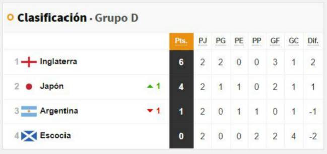 Con este resultado, Argentina se ubica en la tercera posición de la zona, con un punto, detrás de Inglaterra (6 puntos) y Japón (4 unidades). Este viernes, también por el Grupo D, Japón superó 2-1 a Escocia en Rennes.